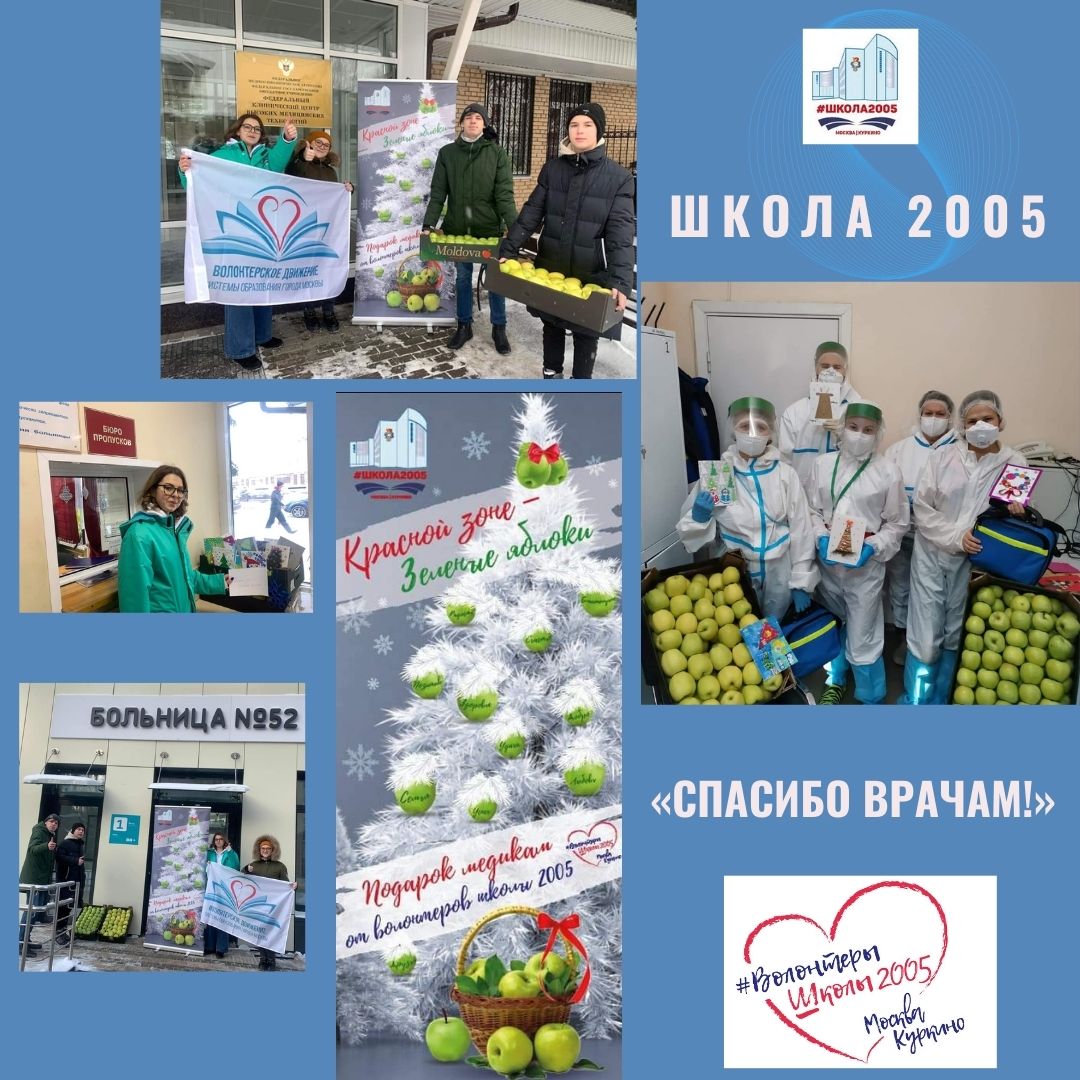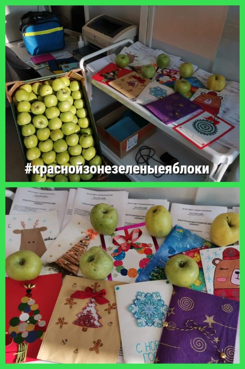 В канун Нового Года волонтёры нашей школы, как и в прошлом году, в знак признания и благодарности отвезли зелёные яблоки, поздравительные открытки врачам, работающим в красных зонах больницы ГКБ № 52 (Москва, ул. Пехотная ул., 3) и Федерального клинического центра высоких медицинских технологий Клинической больницы № 119 г. Химки.