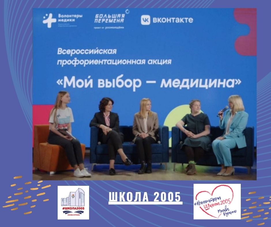 Ольга Кимовна Болотских, руководитель волонтёрского движения нашей школы и добровольческого отряда «Медики 2005», была приглашена экспертом на открытие Всероссийской акции по профориентации школьников в медицину и выступила в дискуссии «Профориентация и медицинское волонтёрство: навстречу друг другу». В нашей школе выстроена целая система профориентации школьников в медицину. Проводятся «Добрые уроки»: «Первая помощь», «Правильное дыхание», «Что такое донорство», «Рак боится смелых». Ученики принимают участие в добровольческих акциях: «Помощники вакцинации», «Красной зоне зелёные яблоки», приезжают с подарками и концертами в пансионаты ветеранов труда и дома престарелых, сажают цветы около хосписов. Добровольчество в сфере здравоохранения развивает не только личные качества, но и помогает узнать различные области медицины и тонкости профессии благородных людей в белых халатах.